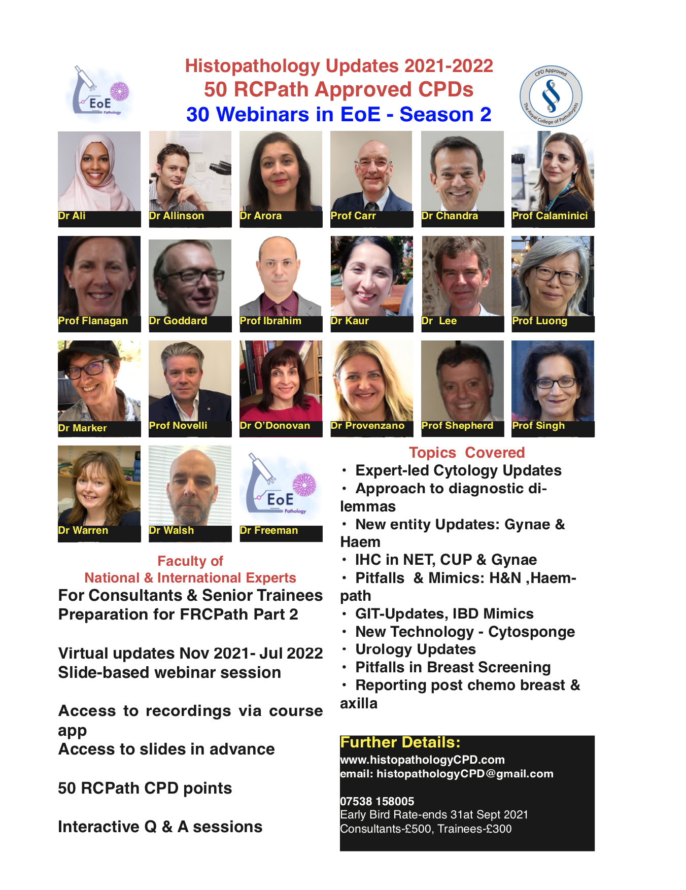 We believe the webinar will be a useful resource containing a range of diagnostic material across all main subspecialties in Histopathology and Cytopathology. Each webinar will last for 2 hours amounting to 2 CPD points/webinar. Delegates will be able to view approximately 20 slides before sessions and writing a reflective note will enable a further CPD point per session. For those Consultants that view slides before the Webinar and attend the entire programme, the total number of CPD points will be 70 (40 RCPath approved CPD points and 30 CPD points for reflective notes).